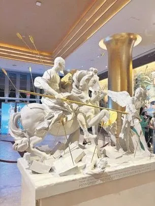 SANAT fuarında Sebastian Errazuriz’in ‘Labirent’in dışında bir eseri de çok konuşuldu. Sanatçı, herkesin dikkatini çeken heykelinde; Jeff Bezos’u şaha kalkan bir atın üstüne yerleştiriyor, Mark Zuckerberg ve Elon Musk’ın ise kılıçlarla bir savaşa girdiği görülüyor.
