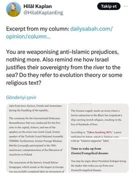 Köşemden bir alıntı: İslam karşıtı önyargıları silah olarak kullanıyorsunuz, bu başka bir şey değil. Ayrıca bana İsrail’in nehirden denize egemenliğini nasıl meşrulaştırdığını hatırlatın. Evrim teorisine mi yoksa dini bir metne mi atıfta bulunuyorlar?