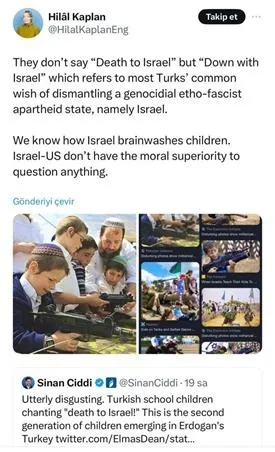 İsrail’e ölüm değil, Kahrolsun İsrail diyorlar ki bu çoğu Türk’ün soykırımcı, etno-faşist bir apartheid devletinin, yani İsrail’in dağılması yönündeki ortak dileğidir. İsrail’in çocukların beynini nasıl yıkadığını biliyoruz. İsrail ve ABD’nin hiçbir şeyi sorgulayacak ahlaki üstünlüğü yoktur.