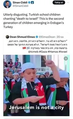 “Tek kelimeyle iğrenç. Türk öğrenciler “İsrail’e ölüm” diye şarkı söylüyorlar. Bunlar Erdoğan Türkiye’sinde yetişen ikinci nesil çocuklar.”