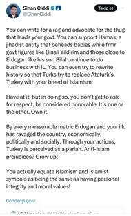 Bir paçavra için yazabilir ve hükümetinize liderlik eden haydutun savunuculuğunu yapabilirsiniz. Binali Yıldırım gibi eski hükümet yetkilileri ve oğlu Bilal gibi Erdoğan’a yakın isimler İsrail ile iş yapmaya devam ederken siz bebeklerin kafasını kesen cihatçı örgüt Hamas’ı destekleyebilirsiniz. Hatta Türklerin Atatürk Türkiye’sinin yerine sizin İslamcılığınızı koymasını sağlamak için tarihi yeniden yazmayı da deneyebilirsiniz. Yapın ama bunu yaparken saygı beklemeyin, onurlu sayılmayı beklemeyin. Sahiplenin.
