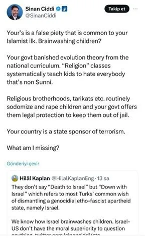 Sizinki, sizin türünüzde İslamcılarda yaygın olan bir sahte dindarlık. Çocukların beynini yıkamak mı? Sizin hükümetiniz müfredattan evrim teorisini kaldırdı. “Din” dersleri sistematik olarak, çocuklara Sünni olmayan herkesten nefret etmeyi öğretiyor. Dini cemaatler, tarikatlar vb. rutin olarak çocuklara tecavüz ediyor ve sizin hükümetiniz onları hapisten uzak tutmak için hukuki koruma sağlıyor.Ülkeniz terörizmin sponsor devletidir. Neyi kaçırıyorum?