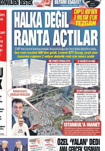 CHP’li İstanbul Büyükşehir Belediyesi’nin (İBB), 2019’da AK Parti’nin park alanı yapmak istediği Levent’teki İETT Garajı’nı imara açması yargıya taşınıyor. SABAH, skandalı 23 Ocak’ta “Halka değil ranta açtılar” manşetiyle gündeme taşımıştı. CHP’li meclis üyelerinin oylarıyla kabul edilen kararla araziye 50 kat gökdelen yapılmasının yolu açılırken, oluşacak rantın 87 milyarı bulacağı kaydedildi.