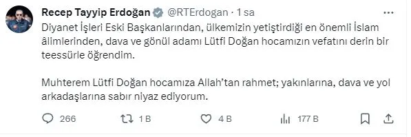 Erdoğan, sosyal medya hesabından yaptığı paylaşımda, “Diyanet İşleri eski başkanlarından, ülkemizin yetiştirdiği en önemli İslam alimlerinden, dava ve gönül adamı Lütfi Doğan Hoca’mızın vefatını derin bir teessürle öğrendim. Muhterem Lütfi Doğan Hoca’mıza Allah’tan rahmet; yakınlarına, dava ve yol arkadaşlarına sabır niyaz ediyorum.” ifadelerini kullandı.