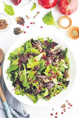 YAPILIŞI: Dolmalık fıstık teflon tavada kavrulur. Karışık yeşilliklerin üzerine nar taneleri ve kavurulmuş fıstıklar eklenir. Sos malzemesi çırpılır ve salatanın üzerine dökülür.