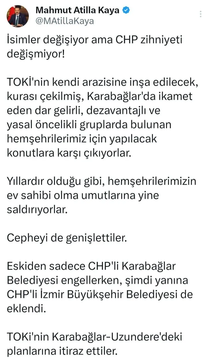 AK Parti İzmir milletvekili Mahmut Atilla Kaya Karabağlar ile Büyükşehir Belediyelerinin plana yaptıkları itirazlara tepki gösterdi. “İsimler değişiyor ama CHP zihniyeti değişmiyor!” diyen Kaya sözlerini şöyle sürdürdü: “TOKİ’nin kendi arazisine inşa edilecek, kurası çekilmiş, Karabağlar’da ikamet eden dar gelirli, dezavantajlı ve yasal öncelikli gruplarda bulunan hemşehrilerimiz için yapılacak konutlara karşı çıkıyorlar. Yıllardır olduğu gibi, hemşehrilerimizin ev sahibi olma umutlarına yine saldırıyorlar. Cepheyi de genişlettiler. Eskiden sadece CHP’li Karabağlar Belediyesi engellerken, şimdi yanına CHP’li İzmir Büyükşehir Belediyesi de eklendi. TOKi’nin Karabağlar-Uzundere’deki planlarına itiraz ettiler. Çıkın, mertçe söyleyin. Sizin, bu projede ev sahibi olacak, aralarında dar gelirliler ve dezavantajlı gruplarla birlikte şehit yakınları, gazi ve gazi yakınları da bulunan 750 hemşehrimizle derdiniz nedir? Hep yaptığınız gibi, hiçbir işe çözüm bulmuyor, İzmirli hemşehrilerimize yapacağımız hizmetlerde de engel oluyorsunuz. Yalnız şunu iyi bilin. Üç yıldır süreci uzatıyorsunuz, belki biraz daha uzatabilirsiniz. Ama bu konutları yapmamızı, 750 vatandaşımızın ev sahibi olmasını asla engelleyemeyeceksiniz!” ifadelerine yer verdi.