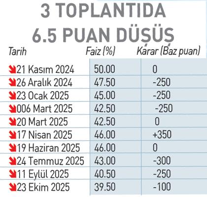 Aralık 2024’te başladığı faiz indirim sürecine, Mart 2025’te ara verip nisanda 350 baz puanlık artırım yapan Türkiye Cumhuriyet Merkez Bankası (TCMB), temmuzda tekrar başladığı indirim sürecini art arda üç toplantıya taşıdı. Merkez Bankası Başkanı Fatih Karahan başkanlığında toplanan Para Politikası Kurulu (PPK) politika faizi olan bir hafta vadeli repo ihale faiz oranının yüzde 40.5’ten 39.5’e indirilmesine karar verdi. Politika faizi Ekim 2023’ten bu yana ilk kez yüzde 40’ın altına indi.