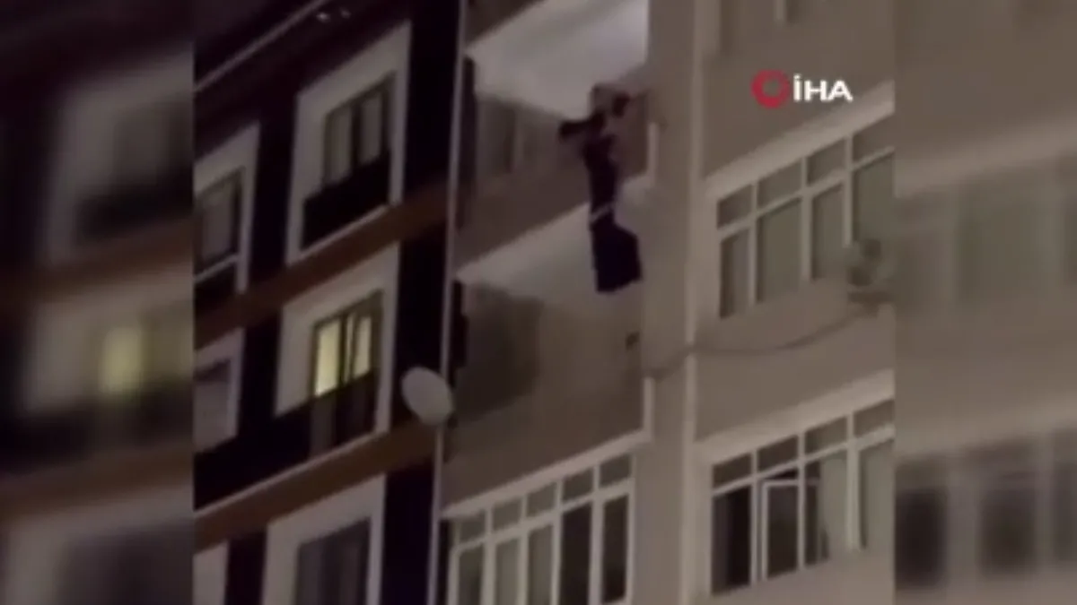 Balkon korkuluklarından tutunan kadın polis tarafından kurtarıldı. Yaşanan anlara ilişkin görüntüler vatandaşlar tarafından kaydedilirken 2 kişi gözaltına alınarak emniyete götürüldü.
