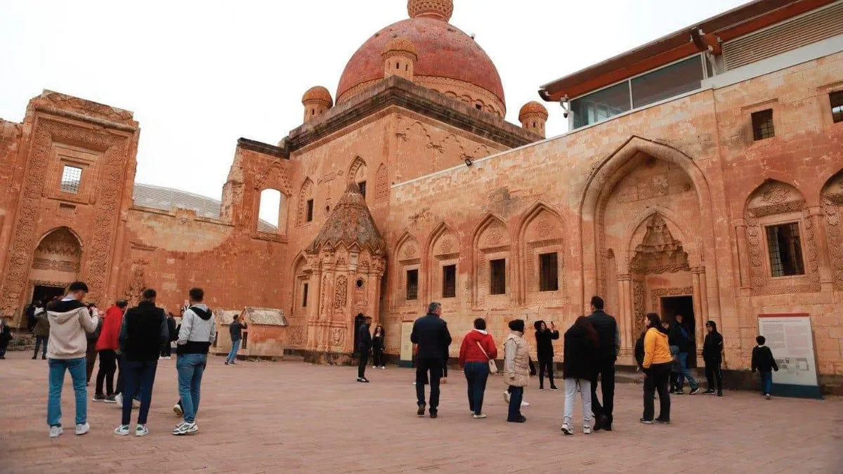 Ağrı’nın Doğubayazıt ilçesinde bulunan ve kartal yuvası görünümü, mimari ve tarihsel özelliğiyle dikkati çeken İshak Paşa Sarayı, geçtiğimiz 9 günlük tatil sürecinde 15 bin 850 yerli ve yabancı ziyaretçiyi ağırladı. Osmanlı’nın en önemli eserlerinden biri olarak kabul edilen ve Doğubayazıt ilçesinin 7 kilometre güneyinde bir tepenin üzerinde kurulu tarihi İshak Paşa Sarayı, Osmanlı, Selçuklu, barok ve rokoko mimarilerinden taşıdığı izler ve süslemelerle ilgi çekmeye devam ediyor. Tarihi saray, Kurban Bayramı’nın 9 günlük sürecinde ziyaretçi akınına uğradı. UNESCO Dünya Miras Geçici Listesi’nde de yer alan tarihi yapının yerleşkesinde cami, odalar, surlar, türbe, iç ve dış avlular, divan ile harem salonları yer alıyor.