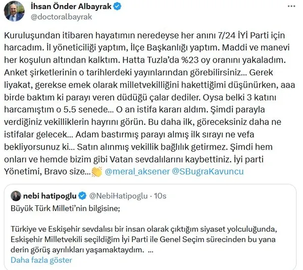 Albayrak Meral Akşener ve İYİ Parti İstanbul İl Başkanı Buğra Kavuncu’yu etiketlediği bir sosyal medya açıklamasında “Göreceksiniz daha ne istifalar olacak” dedi ve partideki “maddi” ilişkilere dikkat çekti.