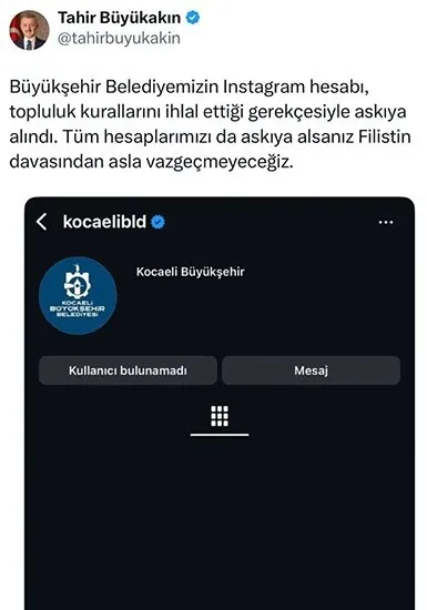 Kocaeli Büyükşehir Belediyesi’nin resmi sosyal medya hesabı, topluluk kurallarını ihlal ettiği gerekçe gösterilerek askıya alındı. Kocaeli Büyükşehir Belediye Başkanı Doç.Dr.Tahir Büyükakın, kendisine ait sosyal medya hesabından bir paylaşımda bulunarak yapılan davranışa tepki gösterdi. Başkan Büyükakın, “Büyükşehir Belediyemizin Instagram hesabı, topluluk kurallarını ihlal ettiği gerekçesiyle askıya alındı. Tüm hesaplarımızı da askıya alsanız Filistin davasından asla vazgeçmeyeceğiz” açıklamasını yaptı.