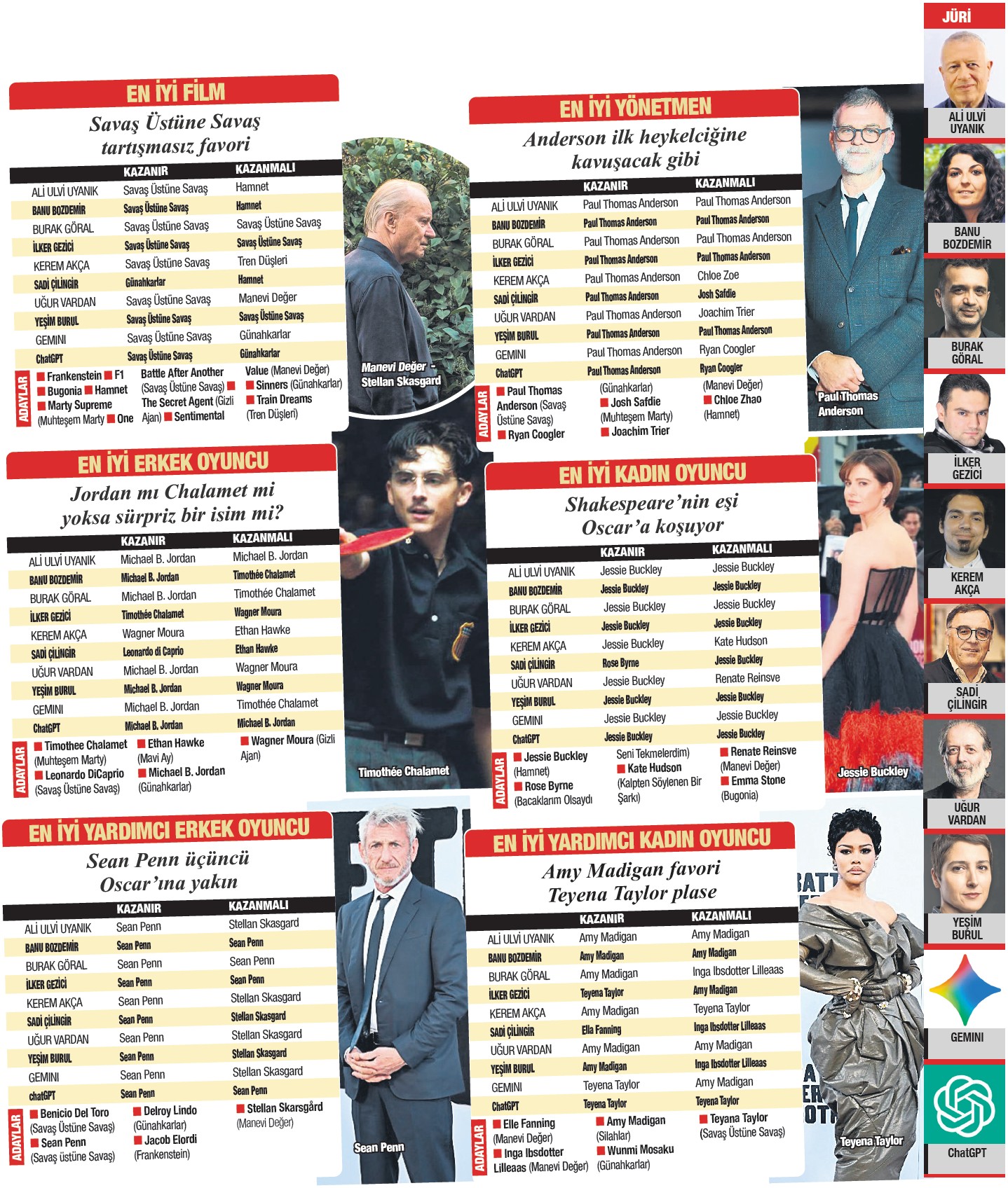 Son dönemde sinema sektörünün özellikle senaristlerin, yapay zekâdan şikâyetçi olduğu biliniyor. Yapay zekânın bu kadar tartışıldığı bir dönemde, onun da tahminlerini almadan olmazdı. Bu nedenle Oscar Toto’ya Gemini ve ChatGPT’nin tahminlerini de ekledim. Heykelciğin kime gideceğinin yanı sıra bakalım kim Trump’ın savaş politikalarına karşı bir çift söz edecek göreceğiz.