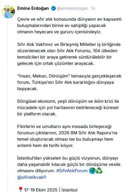 Cumhurbaşkanı Recep Tayyip Erdoğan’ın eşi Emine Erdoğan, 17-19 Ekim’de İstanbul’da düzenlenecek Sıfır Atık Forumu’na ilişkin, “‘İnsan, Mekan, Dönüşüm’ temasıyla gerçekleşecek forum, Türkiye’nin Sıfır Atık kararlılığını dünyaya taşıyacak. Döngüsel ekonomi, yeşil dönüşüm ve iklim krizi ile mücadele için yol haritasının belirleneceği küresel bir platform olacak” ifadelerini kullandı. Emine Erdoğan, NSosyal hesabından yaptığı paylaşımda, çevre ve sıfır atık konusunda dünyanın en kapsamlı buluşmalarından birine ev sahipliği yapacak olmanın heyecanı ve gururu içerisinde olduklarını belirtti.