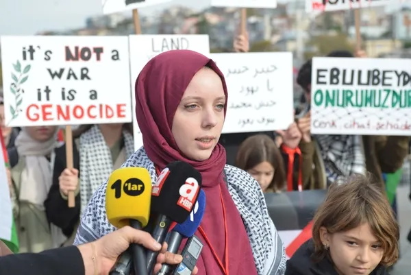 Grup adına konuşan Zeynep Dinler, “75 yıldır devam eden 7 Ekim tarihinde de yoğunlaşan ve aralıksız süren işgalci İsrail’in katliamları neticesinde birçok masum sivil hayatını kaybetmiştir. Hastaneler, ibadethaneler bombalanarak kullanılamaz hale getirilerek ikinci Nekbe yaşatılmaktadır. Şu anda kayıtlara geçen verilere göre en az 11 bin 500 sivil hayatını kaybetmiştir. Bunun 4 bin 600’ü çocuklardan oluşmaktadır” dedi.