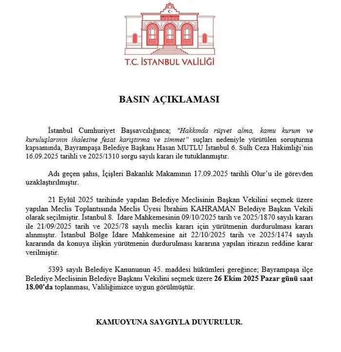 5393 sayılı Belediye Kanununun 45. maddesi hükümleri gereğince; Bayrampaşa İlçe Belediye Meclisinin Belediye Başkanı Vekilini seçmek üzere 26 Ekim 2025 Pazar günü saat 15.00’da toplanması, Valiliğimizce uygun görülmüştür.