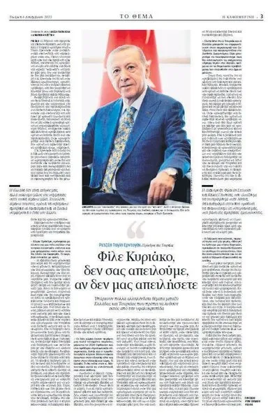 Başkan Erdoğan, 5. Yüksek Düzeyli İşbirliği Konseyi (YDİK) toplantısı vesilesiyle Yunanistan’a bugün yapacağı ziyaret öncesi Yunan Kathimerini Gazetesi’ne konuştu.