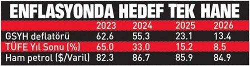 Tek haneli enflasyona giderken büyüme ve istihdam ihmal edilmeyecek. Geçici olarak enflasyonda bir yükseliş söz konusu olduğu için, 2023 yılındaki enflasyon tahmini yüzde 63’lere yükseltildi. Ancak bu geçici bir yükseliş olacak. Orta vadede yüzde 8.5’lik bir tek haneli rakam hedefleniyor. Enflasyon 2024 sonunda yüzde 33’e, 2025 sonunda yüzde 15.2’ye, 2026 sonunda ise yüzde 8.5’e gerileyecek.