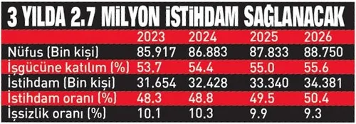 Üç yıllık dönemde 2 milyon 727 bin istihdam artışı bekleniyor. İstihdamda yıllık ortalama 909 bin artış hedefleniyor. İşgücü piyasasına katılım oranında hızlı yükseliş bekleniyor. İşsizlik oranı 2024’te yüzde 10.3’e, 2025’te yüzde 9.9’a, 2026’da yüzde 9.3’e gerileyecek.