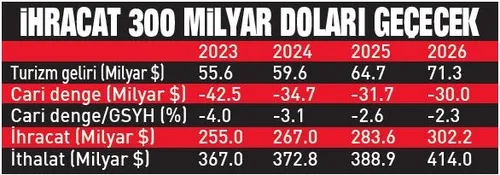 İhracat bu yıl 255 milyar, 2026’da 302 milyar dolara ulaşacak. Cari açığın ikinci dönemde yaşanacak olumlu gelişmelerle milli gelire oranla yüzde 4 olmasını bekleniyor. İzleyen yıllarda çok daha ileri hedefler var. Yurtiçi tasarrufların 1.6 puan artış göstermesi bekleniyor.