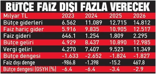 Bu yıl depreme ayrılan bütçe 762 milyar lira, 2024’te 1 trilyon 62 milyar lira. Toplamda 3 trilyona yakın kaynak afetin yaralarını sarmaya kullanılacak. Bu yılın sonunda bütçe dengesinin 1.63 trilyon lira açık vermesi bekleniyor. 2025’te faiz dışı dengenin sıfıra yaklaşması, 2026’da fazla vermesi bekleniyor.