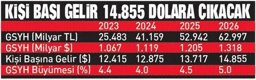 Bu yıl 1 trilyon 67 milyar dolarlık bir milli gelire ulaşılması, nüfusun da 88 milyon 757 bine çıkması bekleniyor. 2026 yılında Türkiye’nin 1 trilyon 318 milyar dolarlık ekonomik büyüklüğe ulaşacağı öngörülen programda kişi başı gelir tahmini 2024 için 12 bin 875 dolar, 2025 için 13 bin 717 dolar, 2026 için ise 14 bin 855 dolar olarak açıklandı.