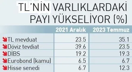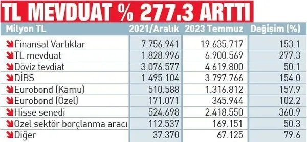 Türkiye Sermaye Piyasaları Birliği verilerine göre, 2021’in aralık ayından, 2023 Temmuz sonuna kadar olan dönemde yurtiçi yerleşiklerin finansal varlıkları yüzde 153.1 artarak 7 trilyon 756 milyar liradan, 19 trilyon 635 milyar liraya çıktı. Bu dönemde TL mevduat yüzde 277.3 artarak 1 trilyon 828 milyar liradan, 6.9 trilyona ulaştı. 2021’in aralık ayında yüzde 23.5 olan TL mevduatın finansal varlıklar içerisindeki payı, 2023’ün temmuz ayında yüzde 35.1’e yükseldi. Böylece TL mevduat finansal varlıklar içerisinde en yüksek paya sahip oldu. TL mevduat ağustos sonunda 7.5 trilyon lirayı aştı.
