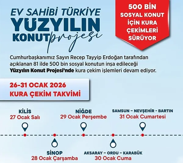 Çevre, Şehircilik ve İklim Değişikliği Bakanı Murat Kurum, Yüzyılın Konut Projesi kapsamında bu hafta 9 ilde daha kura çekilişi yapılacağını bildirdi. Toplu Konut İdaresi (TOKİ) Başkanlığı’nın hayata geçirdiği Yüzyılın Konut Projesi’nin kura çekimlerinde 4 hafta geride kalmış oldu. 29 Aralık 2025’te başlayan kura süreci Giresun’da bin 676 konutun kura çekimiyle devam etti.